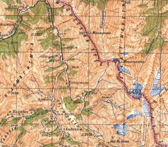 In Chewsuretien von Shatili links oben durch das Tal des Andakistskali nach Mutso. Dann durch enge Seitentäler und über Hochalmen von Südwesten her zur Grenze am Gipfelgrat